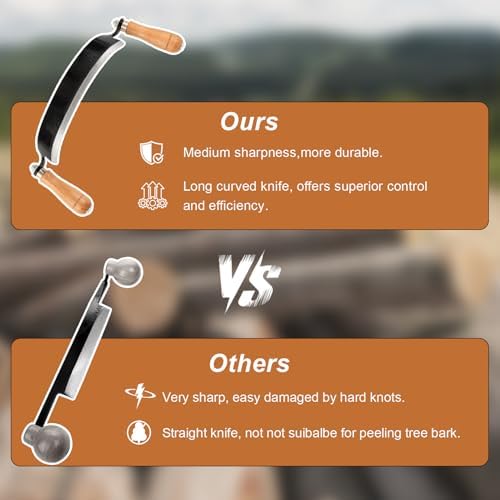 About this item 【10-Inch Long Blade for Large Trees】The extended 10-inch blade is perfectly suited for working on large trees, allowing for efficient and wide coverage when peeling bark or shaping wood. 【Curved Blade Design for Enhanced Performance】The curved blade design offers superior control and efficiency compared to straight blades, making it easier to peel bark smoothly and evenly. 【Medium Sharpness for Durability】Featuring a medium sharpness, the blade is designed to handle tough tasks like peeling tree bark without being damaged by hard knots or branches, ensuring long-lasting use. 【Durable Carbon Steel Construction】Crafted from high-quality carbon steel, the blade maintains its strength and edge, even during demanding woodworking tasks. 【Ergonomic Wooden Handles for Comfort】Equipped with two wooden handles that provide a comfortable and secure grip, this drawknife ensures better control and reduces hand fatigue during extended use.