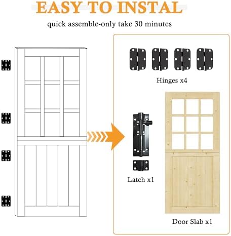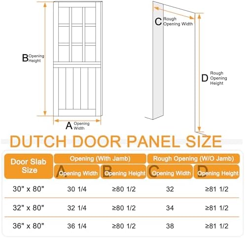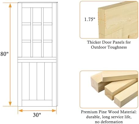 About this item PRODUCT SIZE: Engineered with 1.75-inch thick natural pine wood – 40% thicker than standard 1.38-inch interior doors – this Dutch door slab measures 30″W x 80″H (split into dual 40″ upper/lower sections),Fits door openings measuring(Without Jamb) 32″W x 81.5″H,Fits door openings measuring(With Jamb) 30.25″W x 80.5″H. with 4 hinges and 1 Latch, whether replacing existing front entry doors or creating interior/exterior partitions in house renovations.” DUTCH DOOR STYLE WITH SPLIT FUNCTIONALITY: Elevate your home’s aesthetic with our Dutch Door eaturing a timeless split design that allows independent operation of top and bottom panels—perfect for summer breezes or pet/child safety. The dutch panels layout complements modern and rustic interiors while maximizing natural light flow. Inspired by farmhouse architecture, this door blends vintage charm with contemporary practicality. HIGH-QUALITY MATERIAL SOLID PINE WOOD & SGCC-CERTIFIED GLASS:Built from natural solid pine wood with kiln-dried durability, this door resists warping and cracking in humidity. Paired with 4mm tempered clear glass(SGCC certified), it ensures safety against impacts while maintaining crystal-clear transparency. The unfinished surface accepts any stain or paint, offering endless customization to match your decor. UNIVERSAL FIT FOR INDOOR/OUTDOOR SPACES:Designed for pantries, bedrooms, proch, back , and exterior entries, The universal handing accommodates left/right swing configurations without drilling. Use as a storm door or interior partition—its Pine wood is thick and sturdy. EXCELLENT AFTER-SALES SERVICE: We will provide you with help and service 24 hours a day. If the product has any quality problems or missing parts, or you have any questions about the installation, please feel free to contact us, we will try our best to solve it for you.