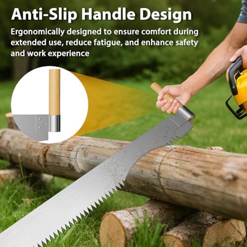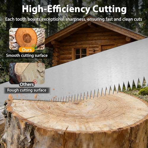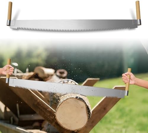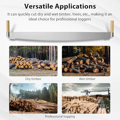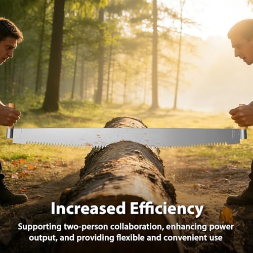 About this item High-Efficiency Cutting: The 4-foot double cross-cutting saw is designed specifically for cutting wood. Each tooth boasts exceptional sharpness, ensuring fast and efficient cutting and sawdust removal Increased Efficiency: The double saw features a wooden handle that is easy to disassemble and replace, supporting two-person collaboration, enhancing power output, and providing flexible and convenient use Durable Design: Constructed from 1.5mm thick high-quality steel, it offers excellent corrosion resistance and is suitable for various harsh weather conditions. Its superior rigidity design ensures stability and durability during extended use Ergonomic: The non-slip handle design improves safety, reduces manual labor, ensures comfort during extended use, reduces fatigue, and enhances the work experience Versatile Applications: Helps you quickly cut wet and dry wood, trees, etc., making it ideal for professional loggers and outdoor enthusiasts