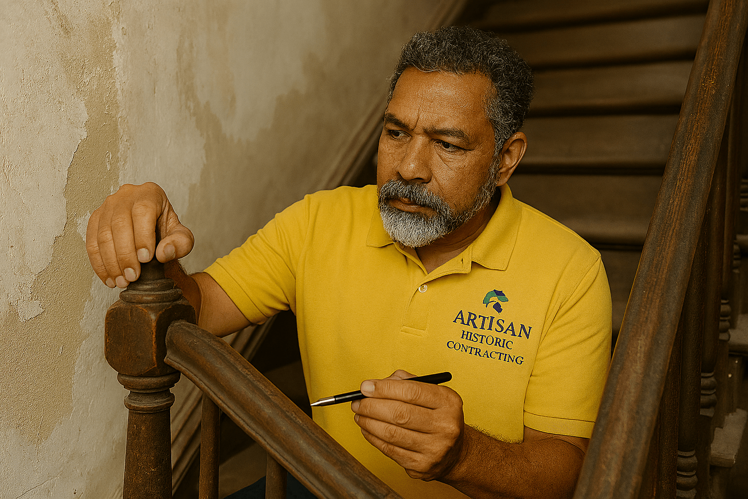 Artisan Historic Contracting inspects and restores historic staircases, ensuring structural safety and preserving architectural details like treads, risers, stringers, and handrails.