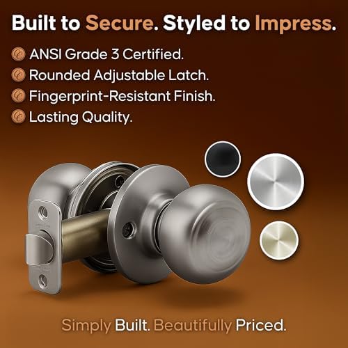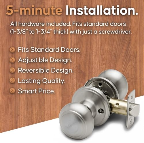 About this item Trusted by Thousands. Our passage knobs and handles are ideal for bedrooms and, closets and hallways and every room where no extra security is needed. Our Ball Knob allows easy access without a locking mechanism for maximum convenience in your home. 5-Minute Installation. Installs quickly with just a screwdriver. Fits all standard doors (1-3/8″ to 1-3/4″ thick) with the included hardware. Adjustable latch fits both 2-3/8″ and 2-3/4″ backsets. Satin Stainless Finish for Modern Interiors Its smooth, silver look resists fingerprints and blends cleanly into both classic and modern home designs without clashing or tarnishing. Built to Last with All-Metal Construction Durable chassis and solid components offer a sturdy, smooth-turning feel that holds up to daily use—no wiggling or loosening over time. Looks Right. Feels Right. Priced Right. Delivers lasting performance and a clean design at a smart price—includes a 30-day return window for added peace of mind. Why pay more? Same Quality. Better Price.