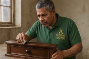 Artisan Historic Contracting provides expert refinishing services for historic wood surfaces, restoring their original beauty while preserving architectural integrity. Our skilled craftspeople—representing a rich blend of Filipino, Maryland Native American, Irish, and African heritage—use traditional techniques and eco-conscious materials to refinish floors, doors, trim, and cabinetry. Each project is a tribute to craftsmanship, history, and cultural pride.