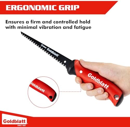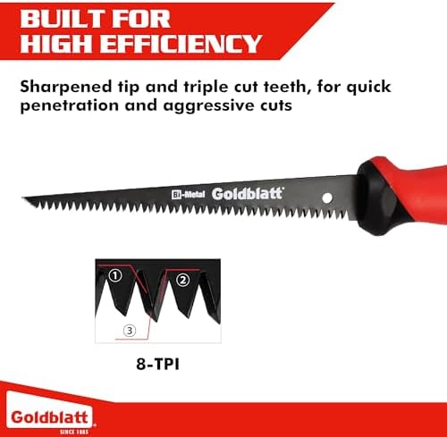 About this item Blade Features: D6A+M2 6-inch bi-metal smooth blade, both sides have inverted teeth to increase the pulling force, three cutting surfaces lead to 50% faster than traditional versatile teeth Ergonomic Grip Design: Lightweight jab saw with soft grip and slip-resistant handle, ergonomically designed for continuous use with minimal fatigue, more prominent handle guard for improved safety Practical & Sturdy: Sharpened tip with an oblique angle for plasterboard or plywood. Precision cross-ground teeth cut in both push and pull directions for fast, clean, and effortless cutting. Deep gullets between saw teeth keep the blade free of material Applications: Suitable for drywall, wallboard, plywood, cement board, thin paneling, and PVC What’s Included: A jab saw with a comfortable grip. Professionally developed to meet your expectations. If unsatisfied with the jab saw, never hesitate to contact us.