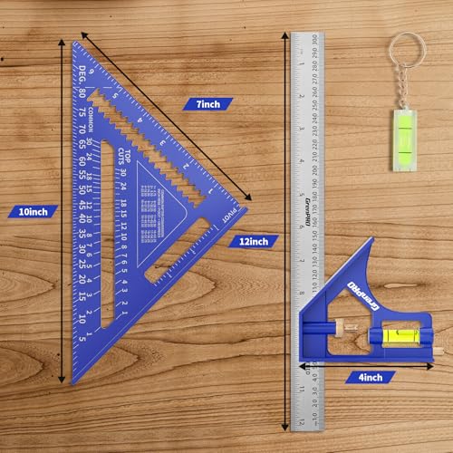 About this item 1.Premium Aluminum-Zinc Alloy Construction – Durable aluminum triangle ruler paired with a sturdy zinc alloy square ruler – designed for your crafting needs, suitable for woodworking tools and accessories, and ideal for handicraft projects 2.Precision Measurement Markings – Features clearly marked scales (metric/mm or SAE/inch) for precise measurements in woodworking tools applications 3.Practical Combination Set – Lightweight carpenter square combined with a heavy-duty woodworking square – an ideal addition to your woodworking tools, specifically designed for straight-edge measuring and 90° verification 4.Secure-Grip Design – Textured edges and locking mechanism ensure stable operation when using these carpentry tools 5.Portable Design – This versatile combination square features lightweight metal construction for easy carrying and storage with your angle measuring tool