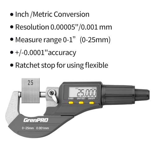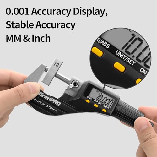 About this item Precision Measurement: Accuracy of ± 0.00005“/0.001 mm, GRENPRO precision micrometers for accurate measurement of precision instruments with a measuring range of 0-25mm/0-1” Metric & Inch: Calipers can be switched between metric and imperial units, providing convenience during use High-Quality Materials: the use of high-quality metal and abs, to ensure long-term use, very reliable LCD Large Screen: LCD large display, easy for engineers to read in the use of the process, to avoid errors caused by display problems Locking Device: This electronic micrometer, with a locking device, can be rotated after the measurement is completed locking device, will not produce error!