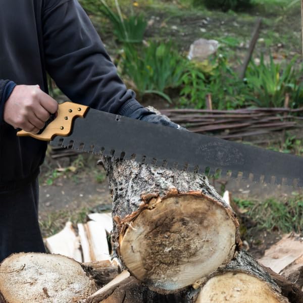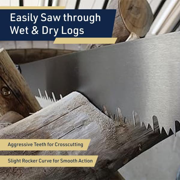 About this item 1-MAN LOG SAW – Tackle log-bucking duties solo with this 3-foot-long one man handsaw for wood. The screw-on auxiliary handle gives you the option for two-hand usage of this timber saw, with a slight rocker curve for smooth action. GREAT AMERICAN STYLE TEETH – This handsaw for wood features aggressive, pre-sharpened teeth that are filed and set for cross cutting, with deep gullets every third tooth in the Great American tooth pattern, and smaller starter teeth over the first 5”. SELF-CLEARING DESIGN – Our logging saw helps you power through both wet and dry wood fast thanks to the gullets in the 1.5mm thick blade, which self-clear waste wood, dust, and debris away from the cut while you work. SUSTAINABLE OPTION – Our wood hand saw provides a quieter, greener alternative to noisy and noxious chainsaws, allowing you to saw the trunks of large felled trees into smaller pieces using only the power of your own two hands. PRODUCT DETAILS – Materials: Steel and Beech Wood. Dimensions: (L) 39.75” x (W) 1” x (H) 5.5”; Handle: (L) 6”; Blade: (L) 36” x (H) 1.5mm. Wood Saw Hand Saw Includes Screw-on Auxiliary Handle. Color: Silver and Natural Wood.