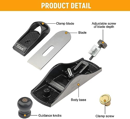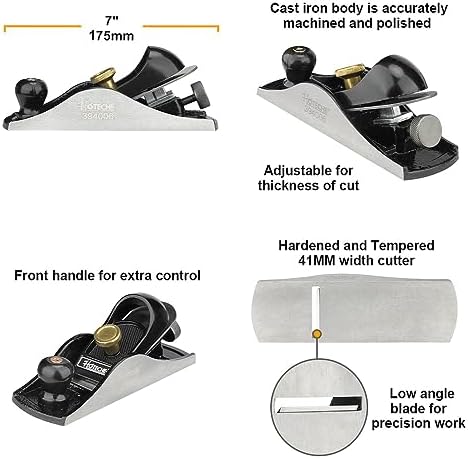 About this item 【Superior Performance】This Wood Plane is equipped with a fully adjustable alloy steel blade that is hardened, tempered, and fully ground. This ensures exceptional cutting performance and precision, allowing you to effortlessly shape and smooth wood surfaces 【Optimal Design】With a body length of 7 inches and a blade size of 1-5/8 inches, this wood plane strikes the perfect balance between maneuverability and versatility. Its compact size allows for easy handling and control, making it suitable for both intricate and larger woodworking projects 【Exceptional Durability】Crafted from high-quality grey iron through precision casting, this Wood Plane is built to last. Its sturdy construction ensures long-term durability and resistance to wear and tear, providing you with a reliable tool that can withstand the demands of woodworking tasks 【Fine Finishing】The plane bottom and sides of this wood plane are meticulously finished, resulting in a smooth and polished surface. This feature enables you to achieve flawless finishes and precise cuts, enhancing the overall quality of your woodworking projects 【 Efficient and Time-Saving】The Hoteche Wood Plane is designed to save you time and effort. Its strength-saving design allows for efficient material removal, reducing fatigue during extended use. With this wood plane, you can achieve smooth surfaces quickly and effortlessly, maximizing your productivity
