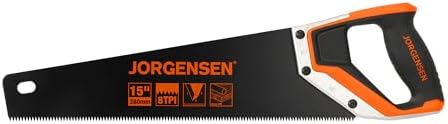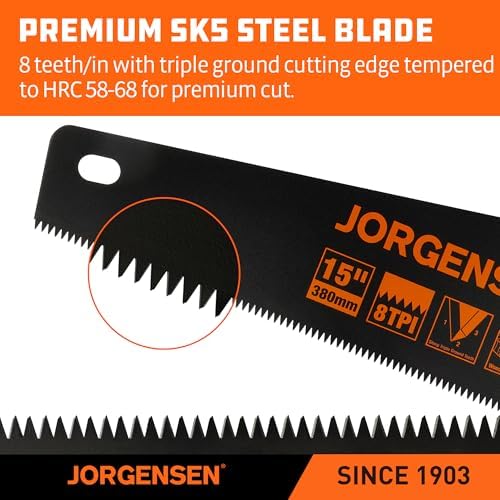 About this item Fast & Efficient Cutting: The JORGENSEN 15” hand saw features 8 TPI and triple-ground teeth for aggressive, 50% faster cuts. Includes a plastic edge protector for safe transport and storage SK5 Steel Blade for Consistent Performance: Crafted from SK5 high-carbon steel, the blade offers excellent edge retention and resists bending during repeated use in woodworking and trimming Teflon Coating for Smoother Cuts: The black Teflon-coated surface reduces friction and material buildup during cutting. This finish also helps protect the blade from moisture and rust Reinforced Ergonomic Handle: Aluminum frame connects securely to the blade. TPE and ABS grip is shaped for comfort, with 45° and 90° angle guides built into the handle for convenient marking Multi-Purpose Use: Designed for various indoor and outdoor tasks like woodworking, pruning, PVC cutting, and more. Suitable for professionals, hobbyists, and DIY projects