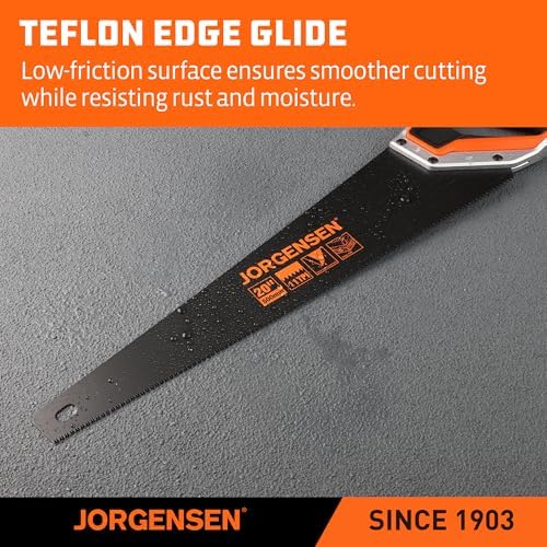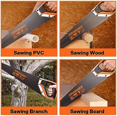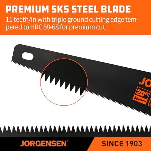 About this item Tips: For precise cuts, use measure and marking as an aid, then through steady pressure to gently guide the teeth into the cutting object to create a groove, where you start cutting deeper Durable Material: Our 20” hand saw is made of 0.85 mm thick low friction black coated blade, three-ground teeth and induction hardened 11 teeth for long-lasting sharpness and durability. So choosing a suitable hand saw is very important to finish excellent wood-cutting work Fast Cutting: Triple-ground teeth and 11TPI (11 teeth per inch) for cutting faster, the low friction black blade has better performance than traditional handsaws, and achieves high efficiency and quality work. Professional hand saw fast cuts on push and pull strokes, deep tooth grooves for quick chip removal Ergonomic Handle: JORGENSEN 20” universal hand saw with a non-slip ABS+TPE soft grip, effectively adds comfort for prolonged work. In addition, the size of the handle is ergonomically designed to relieve hand fatigue during use. Both sides of the handle have 45° and 90° auxiliary angles to get the accurate cutting position Easy to Use: Delicate processing handsaw is specially designed for cutting, and meets your daily basic woodworking, compact size for storage easy to clean and use, can cut plastic PVC pipe, plywood, wall panels and other materials, ideal for woodworkers, carpenters, arborists, gardeners, home decorators and DIY enthusiasts Work Helper: A multi-purpose hand saw, a highly recommended partner in the toolbox. The blade has strong stability, the teeth are protected with extra plastic, and a cardboard sleeve surrounds the blade for easy storage and maintenance. Produces smooth, sharp and fast cuts while ensuring safety