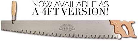 About this item Made in Sheffield England 4 foot saw with Great American style teeth which means each tooth cuts the wood and clears the shavings. The gullets are added to enable the waste wood to be cleared whilst cutting. Comes sharp from the factory. The sharpened bevel on this design are much flatter than other designs. The flatter angles from the factory are the most versatile as you can take metal away for a steeper angle should you prefer but this is a personal preference not necessarily functional in every wood More heavy duty than most modern saws on the market. Made from British CS80 steel with a Rockwell hardness of 44-46 Clear finished beech handle and comes complete with an auxiliary handle which can be attached to the front of the blade for 2 person use or can be fitted to the top back of the blade to help you push the blade if using alone. The handle rivet does not need to be peened but uses a friction fit so you easily move your auxiliary handle from front to back. These saws are made the old fashioned way. Made from British CS80 steel with a Rockwell hardness of 44-46 Blade thickness of 1.5mm to provide the superior stiffness required when cutting on long strokes. Can be Re-sharpened using a Large File