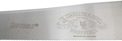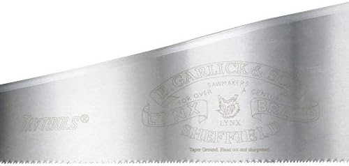 About this item This saw is made by Thomas Flinn of Sheffield England the last traditional saw and plane maker in the UK. Saw plate is made from Sheffield allow spring steel and taper ground providing a good balance of edge durability and ease of sharpening. The saw plate is taper-ground and gets progressively thinner (approx. 0.005 inches) from the teeth to the back of the saw. This greatly reduced binding in the cuts. Handle is stained European Beech with brass button screws 24” saw plate has 10 TPI and filed for cross cutting