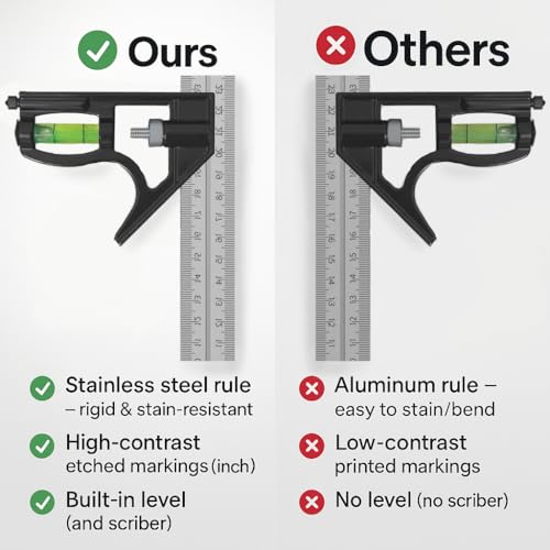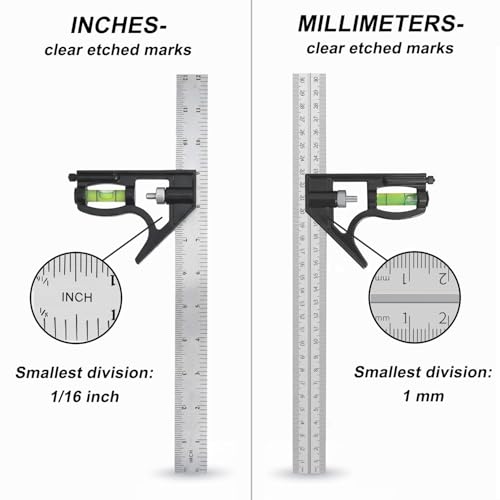 About this item DUAL-SCALE FLEXIBILITY — Metric & imperial in one tool: inch face has 1/8″ and 1/16″ on opposite edges; metric face reads in clean 1 mm steps. Deep-etched graduations stay clear after heavy shop use BUILT TO LAST — 410 stainless-steel rule resists wear and corrosion; the powder‑coated aluminum head is tough yet lightweight for daily jobsites. Flat reference faces support reliable marking and checks ACCURATE 90° & 45° LAYOUTS — Quickly mark square and miter lines, check corners, and set tool depths and heights—ideal for woodworking, carpentry, framing and light metalwork SMOOTH, SECURE ADJUSTMENT — Precision sliding head with a positive-lock mechanism holds your measurement so the rule won’t slip while you scribe or transfer dimensions and includes a convenient marking scriber stored in the head INTEGRATED LEVEL VIAL — Built-in bubble level speeds jig and machine setup without reaching for a separate tool. 12″ (300 mm) reach covers most shop projects; a dependable choice for pros and DIYers
