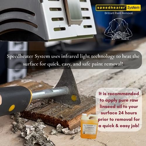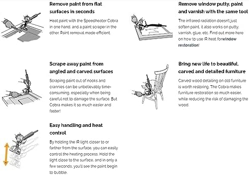 FAST & EFFICIENT: Speedheater works to heat the surface of paint and varnish just enough so that it melts away with ease. Heat your surface and scrape after just a few seconds for quick and easy removal. COMPACT, LIGHTWEIGHT, EASY TO USE, HANDLE & STORE: Simply plug the Speedheater in, flip the switch, and remove paint in the matter of seconds. Flexible head allows ease of use and efficiency in removing paint from wood detailing including ornate table legs, banisters, gingerbread trim and beautifully carved detailing on furniture. NON-TOXIC & SAFE W/ NO CHEMICALS REQUIRED: Speedheater heats your surface to allow for easy removal of paint and varnish. Scrapings are contained and solid. No chemicals required and no liquid to clean unlike conventional paint strippers. Speedheater uses IR technology to work well below the threshold required to vaporize lead making it the safest paint removal option available. NO LEAD VAPOR: Speedheater works in temperatures of 230-320°F (110-160°C). A traditional hot air gun works in temperatures of 700°F (400°C). Lead starts to evaporate at around 680°F (370°C). Speedheater is the safest paint removal method available with no chance of vaporizing lead unlike other heating methods. VERSATILE: Speedheater works to remove all types of paint, varnish, and glue on all interior and exterior wooden surfaces such as windows, furniture, boats, stairs, doors as well as concrete!